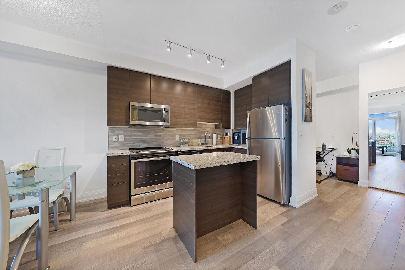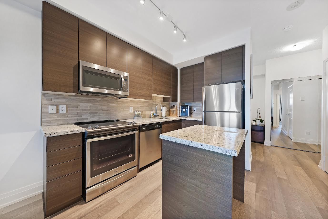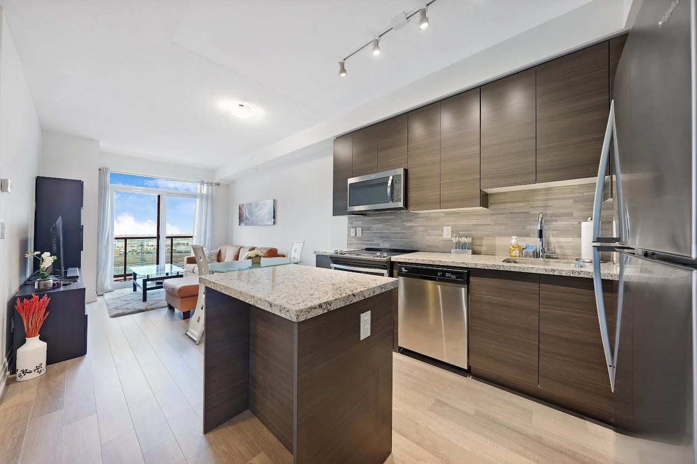 This Fully Upgraded, Modern & Bright 1 Bedroom + Den 650 Sq Ft + 40 Sq Ft Balcony W/ Unobstructed East Side Views Condo Features 9 Ft Ceilings, Open Concept Layout And High-End Finishes. Upgraded Entry W/Frameless Double Door Mirrored Closet, Upgraded Kitchen Cabinets Equipped With Stainless Steel Appliances, Granite Countertops, A Custom Backsplash And A Central Island. Wake Up With The Warm Morning Sunrise That Enters The Living Room & The Spacious Bedroom W/Walk In Closet Offering Ample Storage Space. Upgraded Bathroom Finishing's W/Rain Shower, Quartz Countertop W/Undermount Sink And Extended Cabinets For Extra Space. Upgraded Cobblestone Oak Lexington Laminate Through Out. The State Of The Art Recreation Facility Includes: 24Hr Concierge, Golf Simulator, Indoor Swimming Pool, Sauna And Hot Tub, Yoga Studio, Billiards Room, Gym, Meeting Room, Media Room, Bike Lockers, Ample Visitor Parking, Third Floor Terrace W/ BBQs. Steps From Shops, Cinemas, Restaurants, Vaughan Mills Mall, Wonderland, TTC Subway & Highways 400/407/7. One Locker & One Parking Spot Conveniently Located Near Elevators.